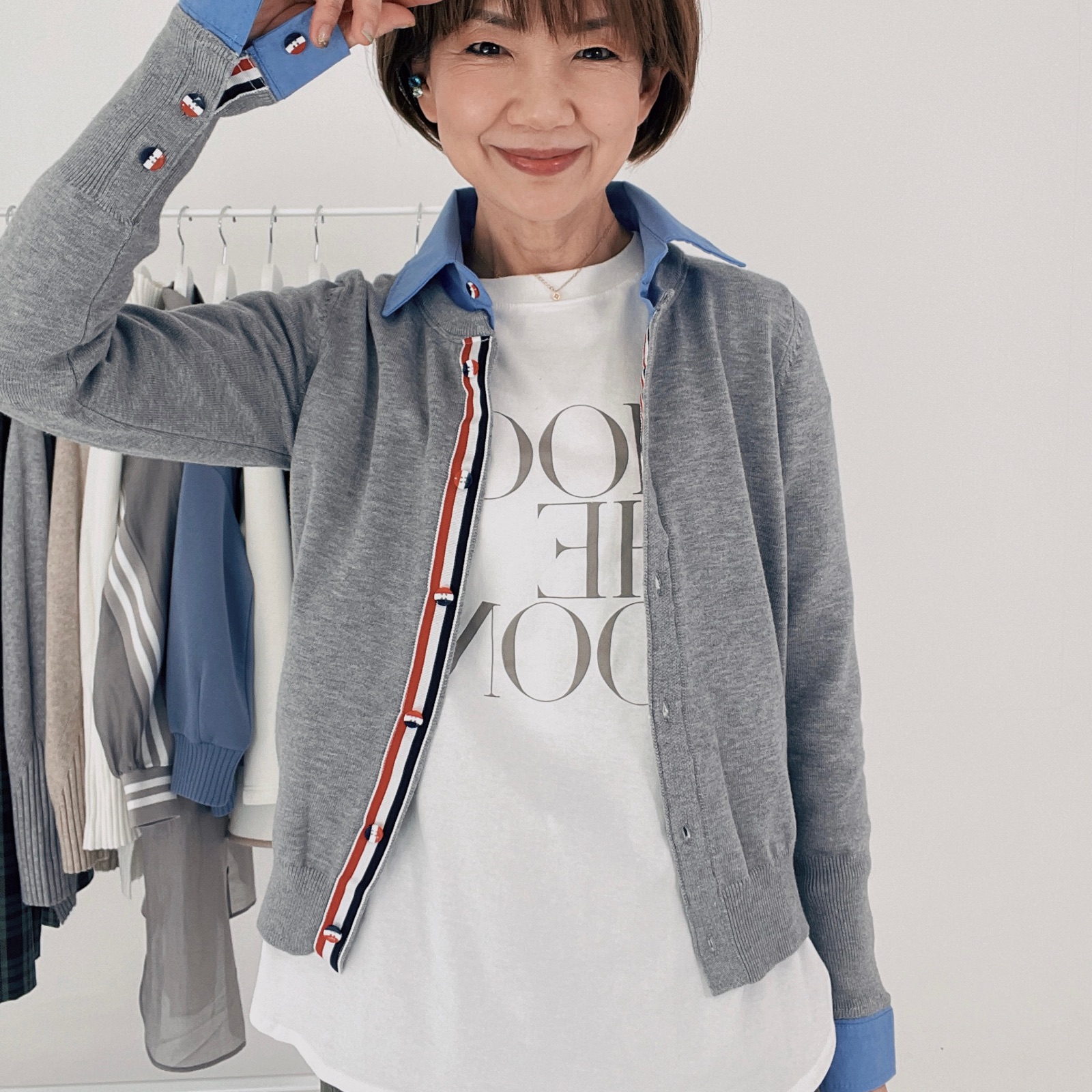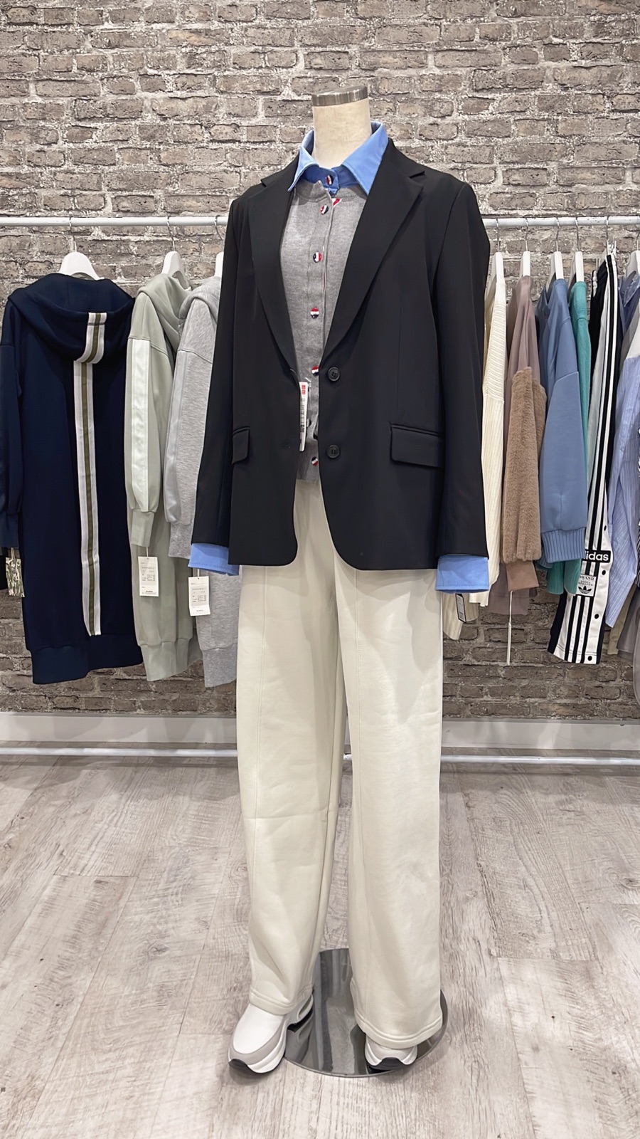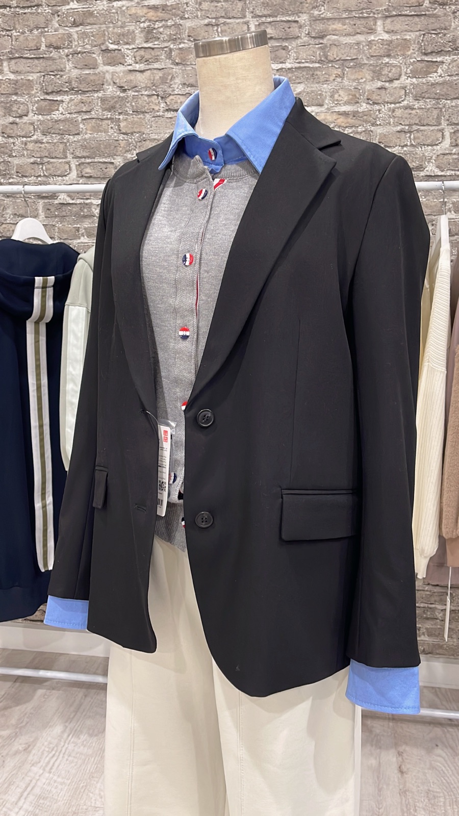 一体化カーディガンに黒ジャケットを合わせて見たくて UNIQLOで調達してきました。